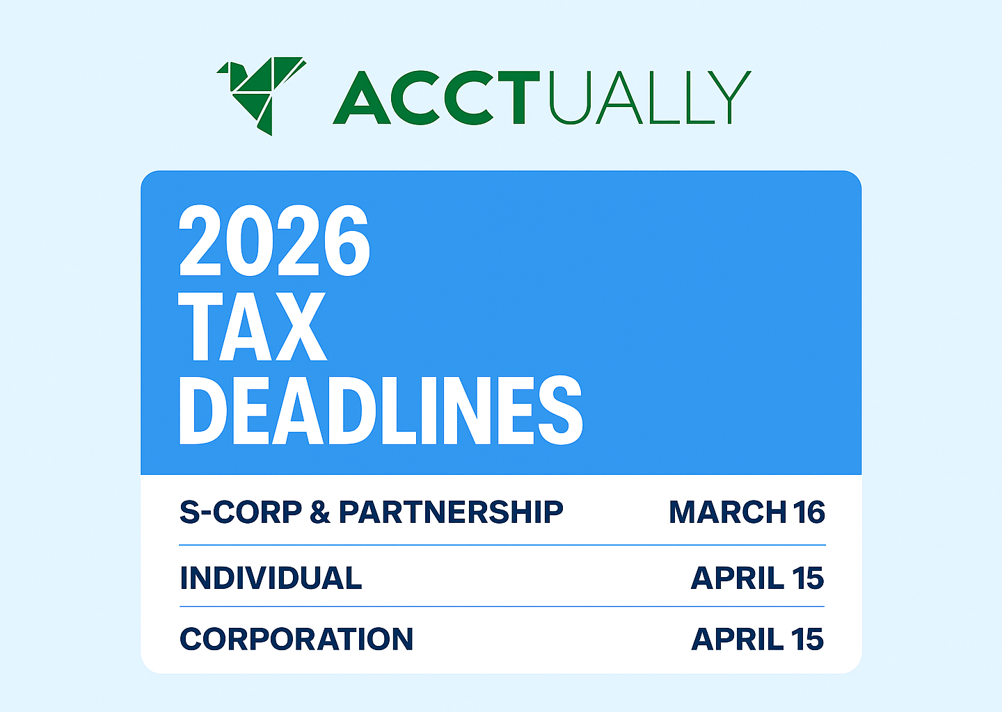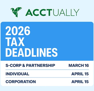 Whether you run an S‑Corp, partnership, LLC, or you file as an individual, understanding your 2026 deadlines is the difference between a smooth season and unnecessary penalties. Here’s the Acctually version: simple, clear, and built for real people.