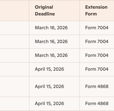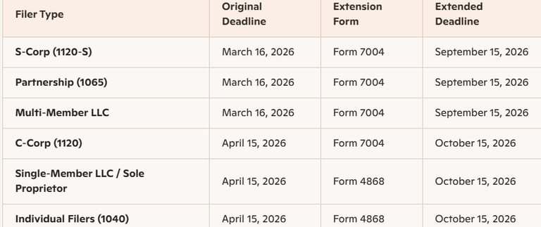 2026 Business Tax Extension Deadlines: What Every S‑Corp, Partnership, LLC, and Individual Filer Should Know